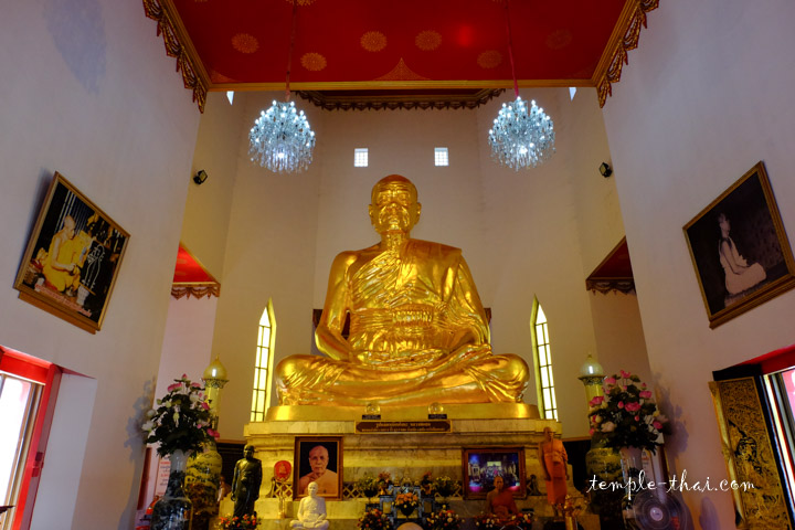 Dans cet édifice central, la statue dorée en métal de 45 tonnes (!) représente Luang Po Sot (หลวงพ่อสด – 1884-1959), plus connu sous le nom de Luang Po Wat Paknam (หลวงพ่อวัดปากน้ำ), en référence au Wat Paknam donc, célèbre monastère de Bangkok où il enseigna à partir de 1916 l’approche méditative Thammakaya, qui fit sa renommée.