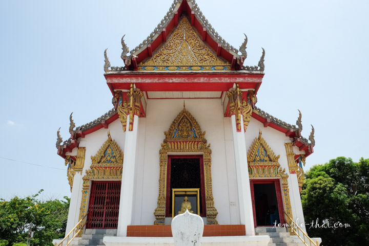 À l’intérieur, la pièce quadrillée par des colonnes octogonales présente un beau bouddha de style Ayutthaya, d’une envergure d’environ quatre mètres.