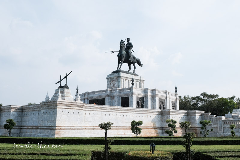 Si vous arrivez au Wat Phu Khao Thong par l’avenue côté est, la statue au centre du rond point représente le roi Naresuan sur son cheval (สมเด็จพระนเรศวรมหาราช), celui-là même qui d’après les chroniques rendit son indépendance au Royaume d’Ayutthaya, à la fin du XVIe siècle.