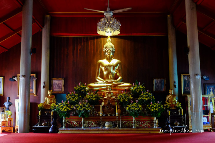Dans cette magnifique salle et sa charpente en bois, une statue du Bouddha rayonnante est placée sur l’autel.