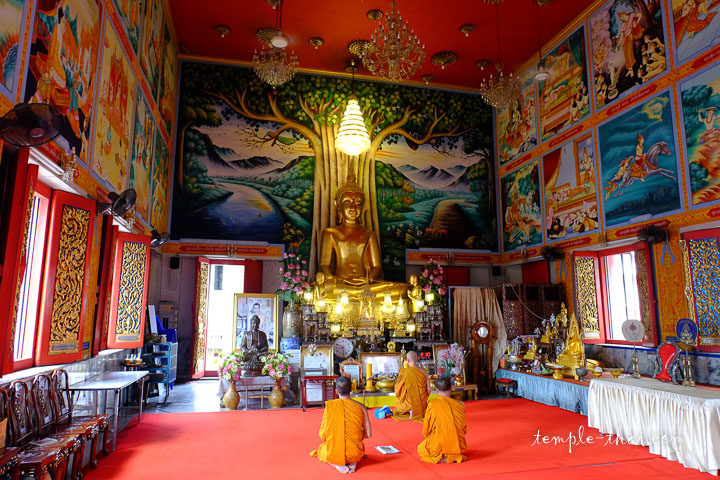 Après avoir identifié l’entrée, vous faites face à l’Ubosot des lieux dont l’intérieur est tapissé de fresques colorées marquant les étapes clés de la vie du Bouddha, tel son Éveil sous l’arbre de la Bodhi ou son premier sermon.