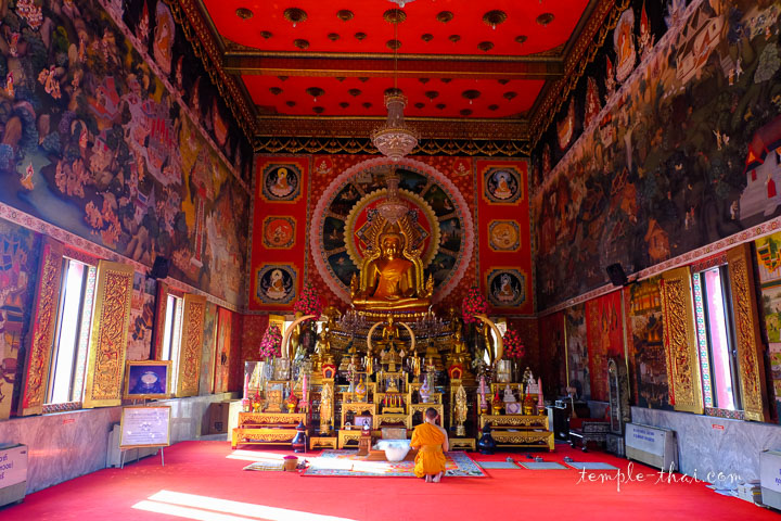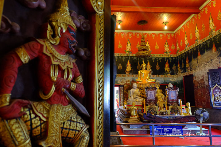 Cette ancienneté s’observe dans le Viharn, reconnaissable à ses nombreuses statues couvertes d’or sous son porche. Les murs intérieurs sont quant à eux recouverts de fresques d’époques légèrement défraichies par endroit.