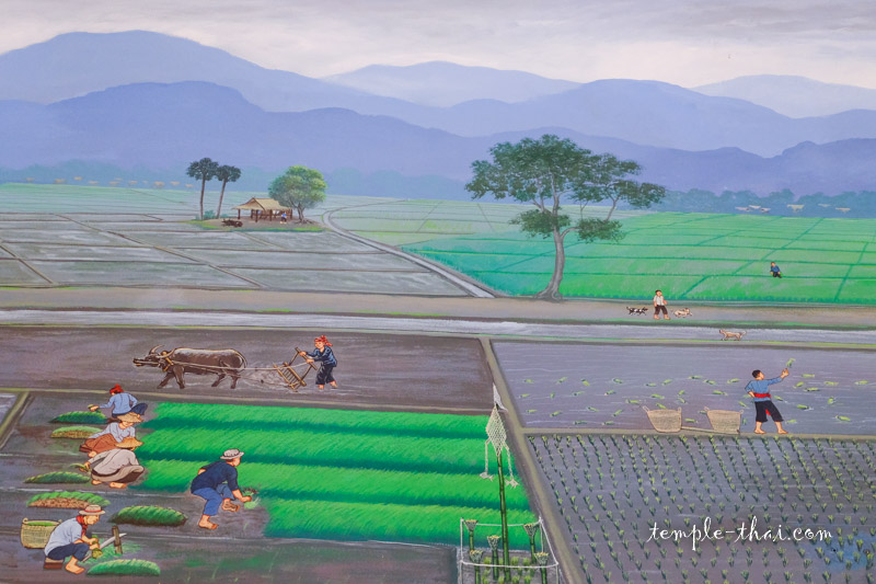 Elles dépeignent la vie à la campagne, la visite du roi Rama IX dans ce temple, la construction du stupa, des festivals et célébrations religieuses, le tout agrémenté de quelques anachronismes apposés par les artistes.