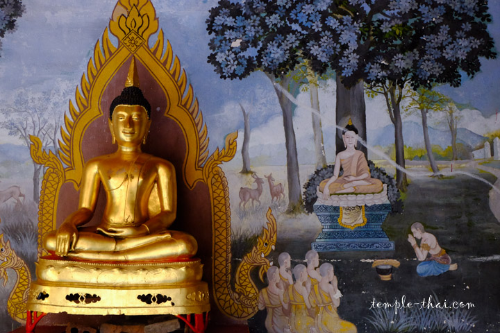 Les peintures murales derrière ces statues évoquent les moments clés de la vie du Bouddha historique, dans un ordre chronologique.