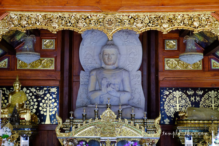 Dans un contraste apparent avec le bois, le bouddha principal est une statue en pierre en haut-relief.