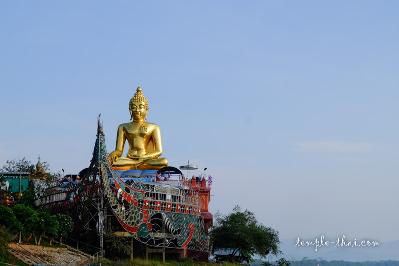 Au-delà de la vue sur les pays voisins, des casinos sur la rive laotienne, des boutiques souvenirs et d’un musée de l’opium, l’attraction spirituelle prend la forme d’un bouddha géant de style chiang saen. Il est installé sur un navire factice.