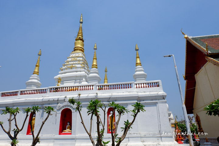 De base carré, ressemblant à un cube, le dessus est pourvu d’un stupa principal et de six plus petits posés autour. Sa configuration renvoie au célèbre temple de Chiang Mai portant le même nom.