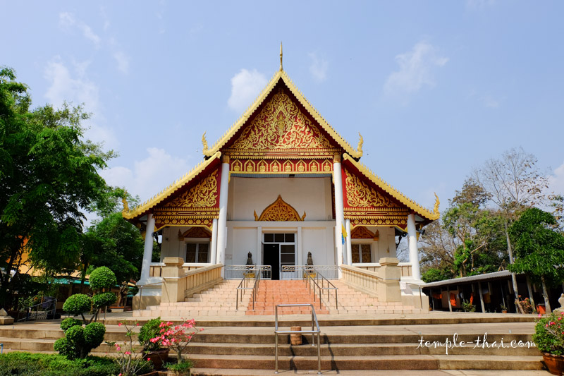 À l’intérieur, on retrouve des colonnes décorées et un bouddha principal installé sur l’autel central.