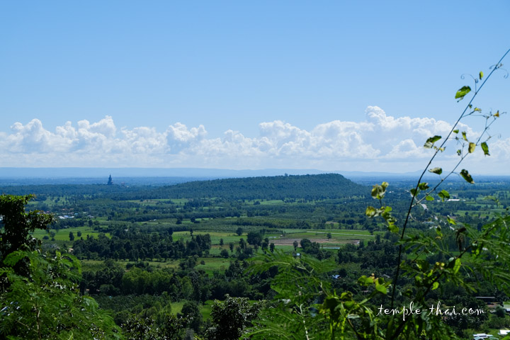 Depuis la plateforme au sommet de l’escalier, la vue panoramique permet d’apercevoir l’emplacement de trois temples à ne pas manquer dans la province de Kalasin.