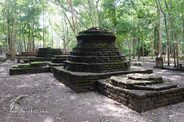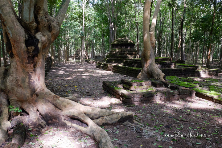 Arrivé par le côté sud-est, le temple prend la configuration suivante : un mur d’enceinte enserre quatre stupas alignés sur un même axe, parfois écartés de plusieurs mètres l’un de l’autre.