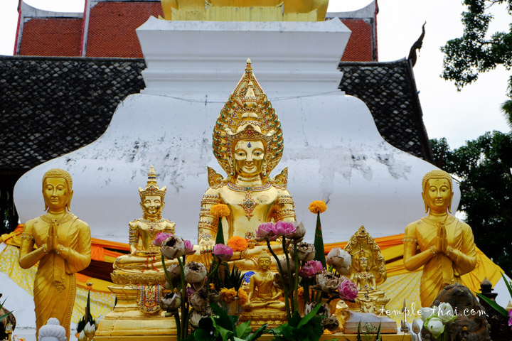 À l’arrière de ce Sim, un parc fleuri cache quelques statues alors qu’un étang débordant de poissons est légèrement excentré au sud du Phrathat Kham Kaen.