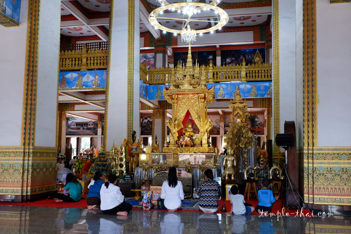 Au rez-de-chaussée, ou première étage puisque l’on est en Thaïlande, la vaste salle sert essentiellement aux fidèles venant prier en nombre, surtout le week-end, et faire des offrandes à la communauté monastique, des mérites.