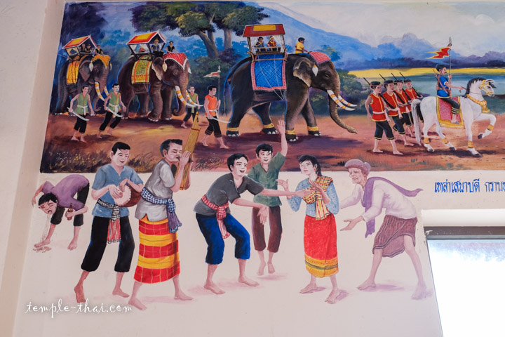 Des peintures murales sur les parties supérieures des murs dépeignent essentiellement la vie locale en Isan ou certains temples de la province.