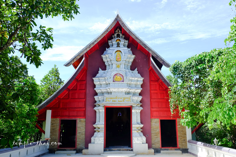 Le second Viharn est un peu plus loin. Installé au milieu d’arbustes, son fronton compact propose un contraste saillant entre le bois aux teintes rouges et des ornements blancs en stuc.