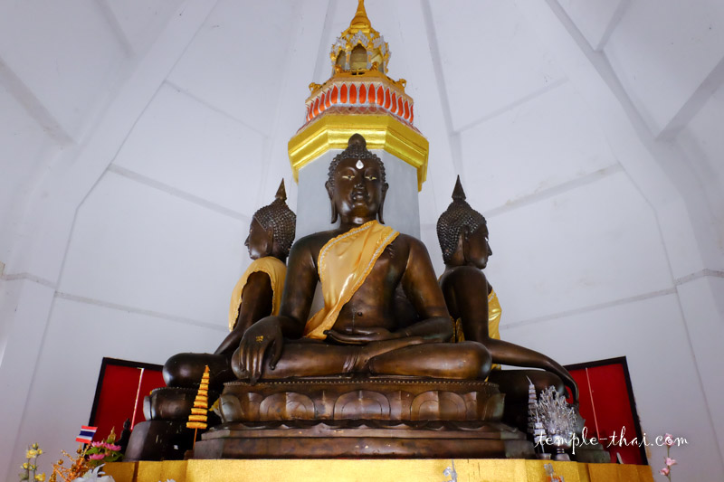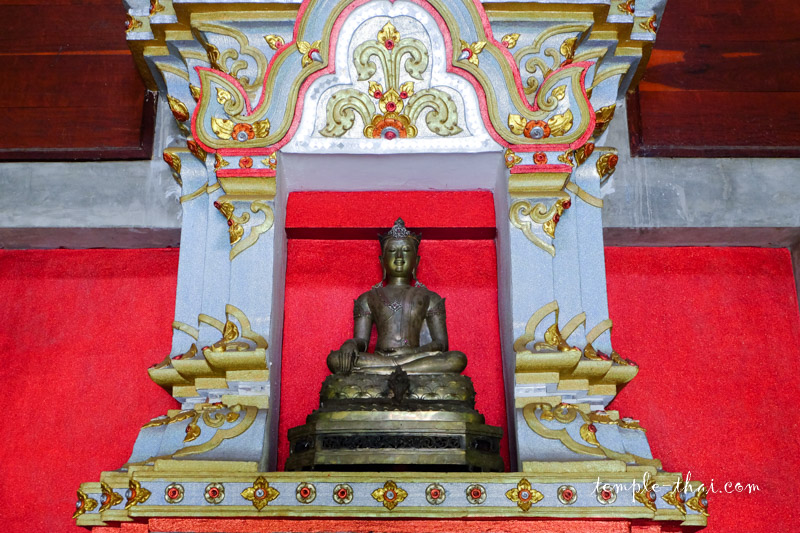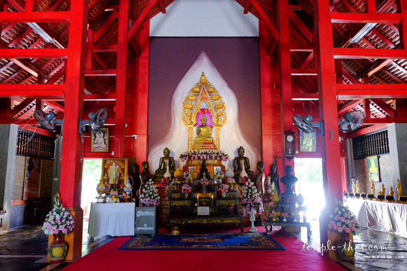 Plusieurs bouddhas sont exposés à l’intérieur mais le bouddha principal et son nimbe clignotant paraît avoir été coulé en bronze.