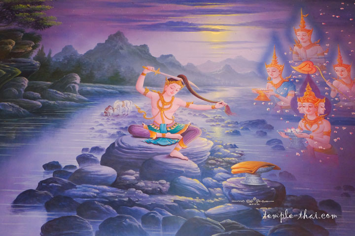Peinture de Siddartha Gautama coupant ses longs cheveux