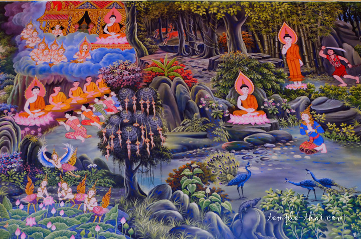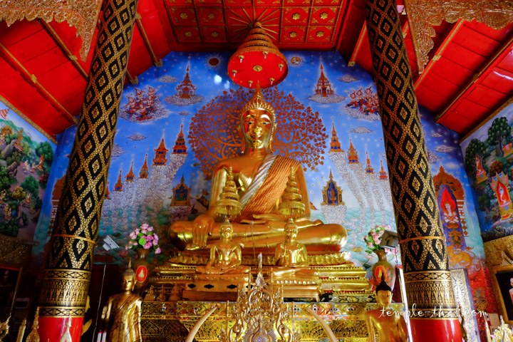 L’autel où siège le bouddha principal, d’une envergure d’environ quatre mètres, est entouré de peintures murales sur les parties supérieures, plus fines qu’à l’accoutumé. Elles dépeignent notamment l’histoire de la vie du Bouddha.