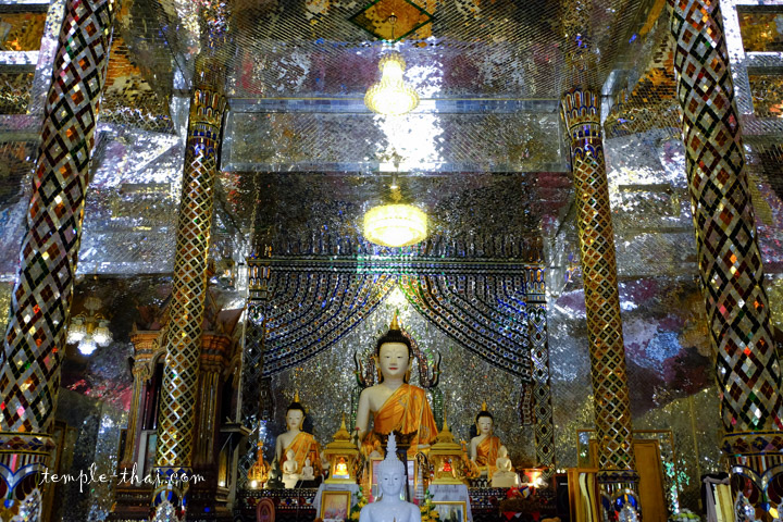 Du fait de sa couleur blanche et son apparence sobre, le bouddha principal contraste en tout point avec les décorations scintillantes qui l’entourent.