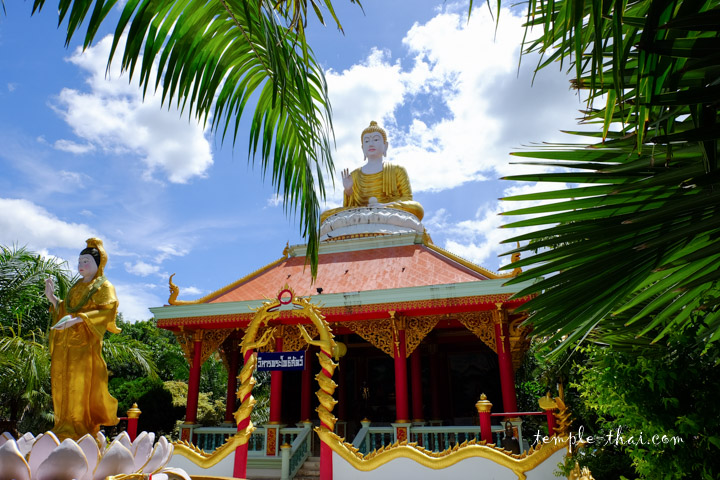 À ses côtés, une statue de Guanyin est placée au milieu d’un bassin. Elle précède un Viharn ouvert, reconnaissable à un bouddha placé sur le toit.