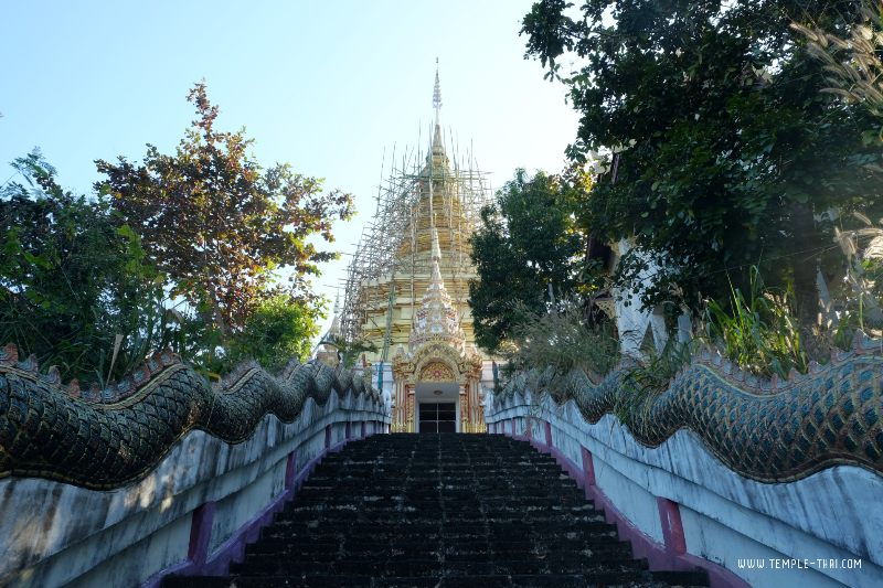 Au pied de la colline, un escalier photogénique permet d’atteindre le stupa doré visible au loin.