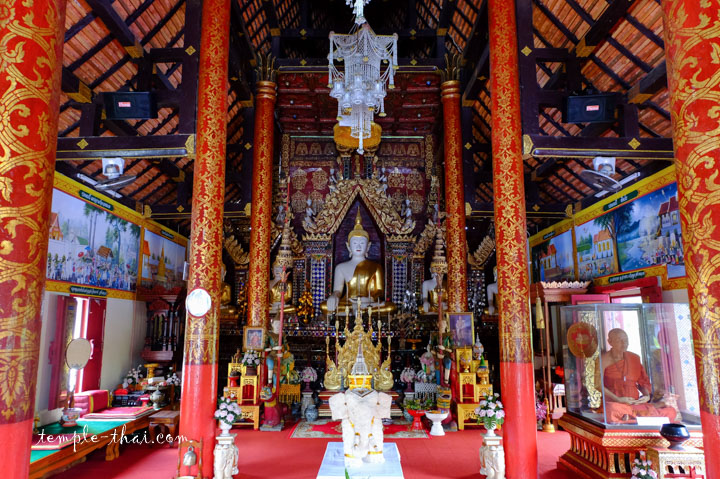 À l’intérieur, les colonnes parallèles et les poutres apparentes délimitent cette jolie salle ou cinq bouddhas similaires et bicolores sont accolés au mur, les plus modestes vers l’extérieur, et le principal en plein centre.