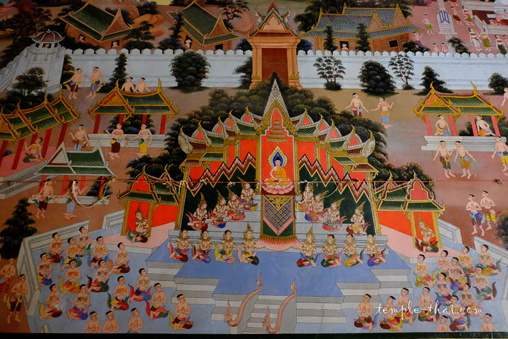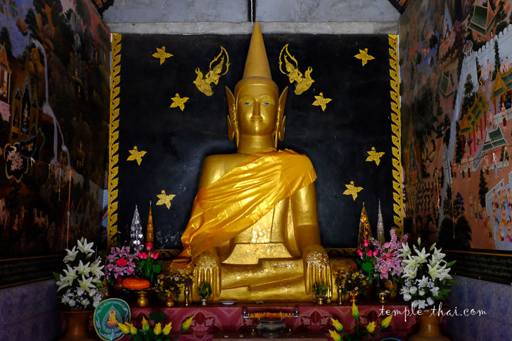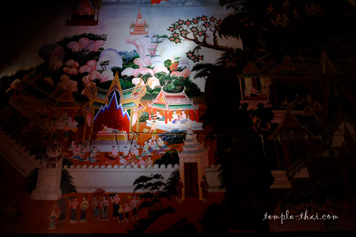 Autour de lui, de belles peintures murales récentes couvrent la totalité des murs latéraux. Aux détails multiples, elles semblent mettre en scène la vie de Siddartha Gautama, le Bouddha historique.