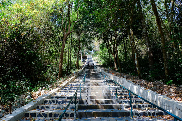 Pour l’atteindre toutefois, il n’y a pas de routes, vous n’aurez pas le choix, il faudra emprunter le long escalier, environ 300 marches dans la nature. Depuis mon passage en 2016, deux Nagas enserrent l’escalier, sur le même modèle qu’au Wat Phrathat Doi Suthep (วัดพระธาตุดอยสุเทพ), à Chiang Mai.