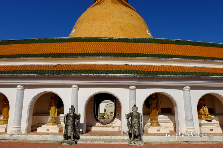Ils sont reliés par un mur qui suit la base arrondie du Chedi. Sur la partie extérieure du mur d’enceinte, des bouddhas sont alignés.