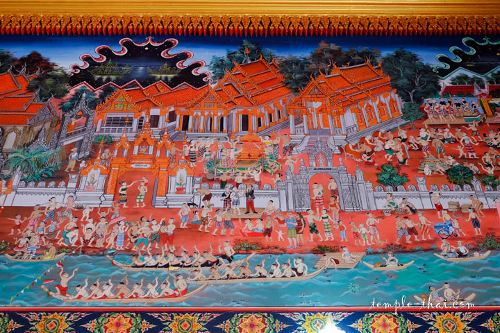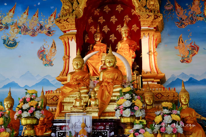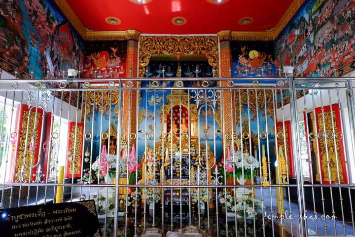 Elles siègent à l’heure actuelle dans ce Viharn, dont l’intérieur est décoré de peintures murales colorées aux détails multiples qui semblent dépeindre l’histoire légendaire de ces deux bouddhas.