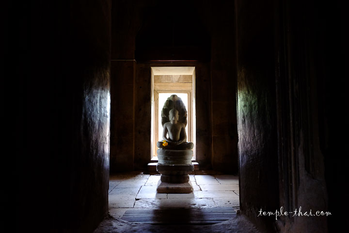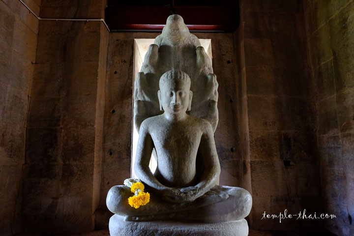 À l’intérieur, sombre comme un vieux château fort, le couloir vous mène au cœur du sanctuaire où siège un bouddha en grès. Il est représenté protégé par le serpent protecteur nommé Mucalinda.
