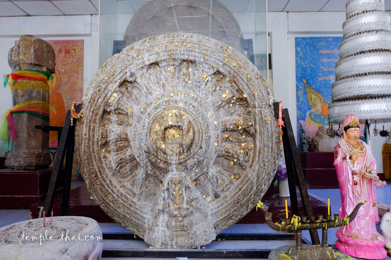 Dans l’enceinte du Wat Thammachak Semaram, un second pavillon expose d’autres objets attribués à l’ère de Dvâravatî, notamment une Roue de la loi bouddhique.