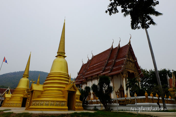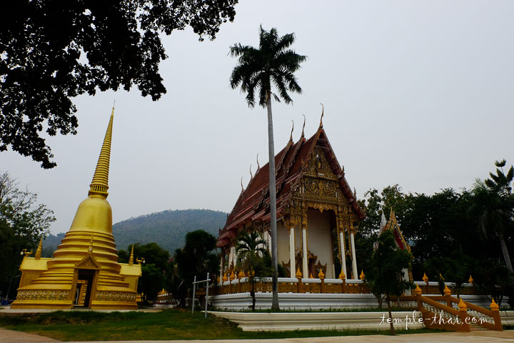 Dans la zone au pied de la colline justement, on trouve plusieurs Sala, c’est-à-dire les lieux de vie et d’enseignements, ainsi que l’Ubosot des lieux, bordé par deux stupas récents et un palmier solitaire.