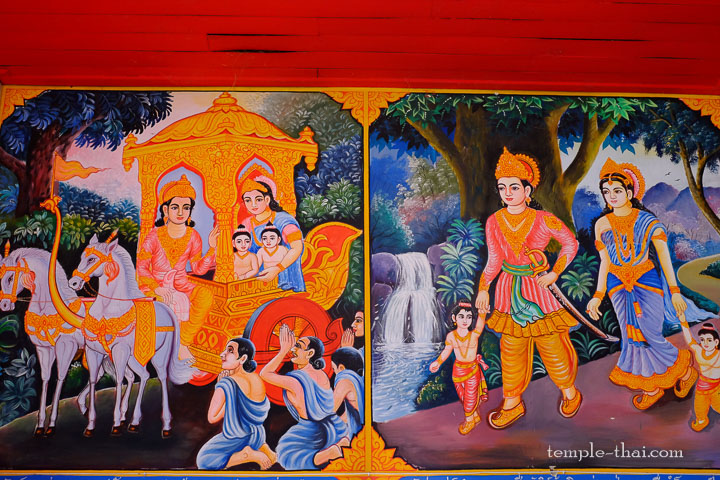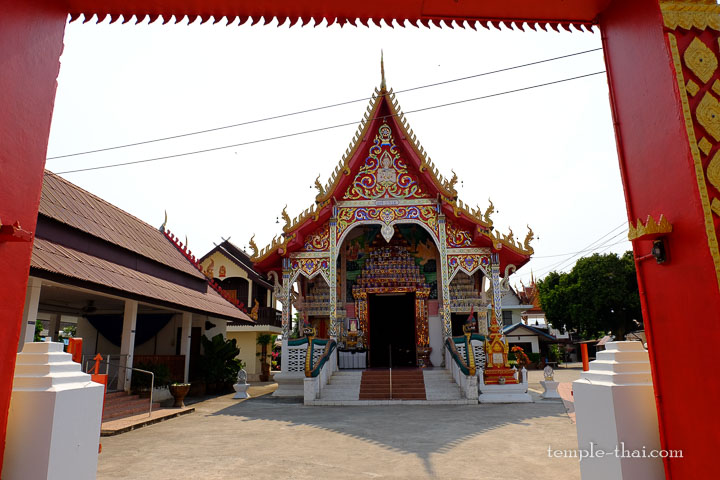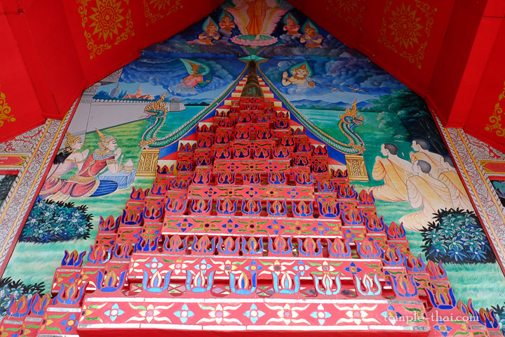 Sur l’extérieur, l’Ubosot affiche de belles décorations, notamment des fresques sous son porche, mais aussi de beaux gables et lambrequins aux teintes rouges. Ils sont décorés à l’aide de miroirs multicolores dessinant des motifs floraux.