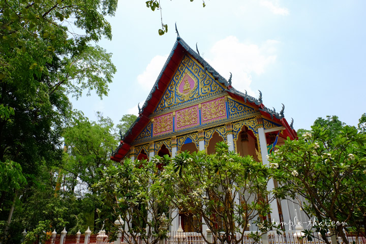 Au milieu de la végétation, vous découvrez alors l’Ubosot et ses multiples colonnes qui encerclent l’édifice, au moins deux Sala en bois, mais surtout le Viharn du temple, dont la construction s’est achevée en 1998.