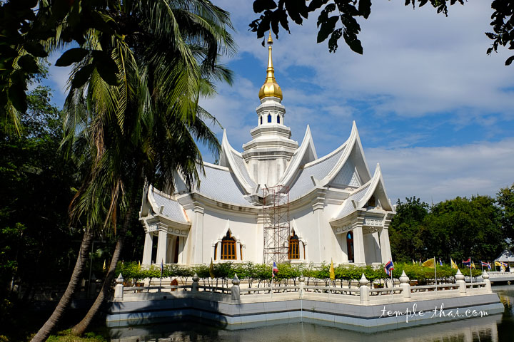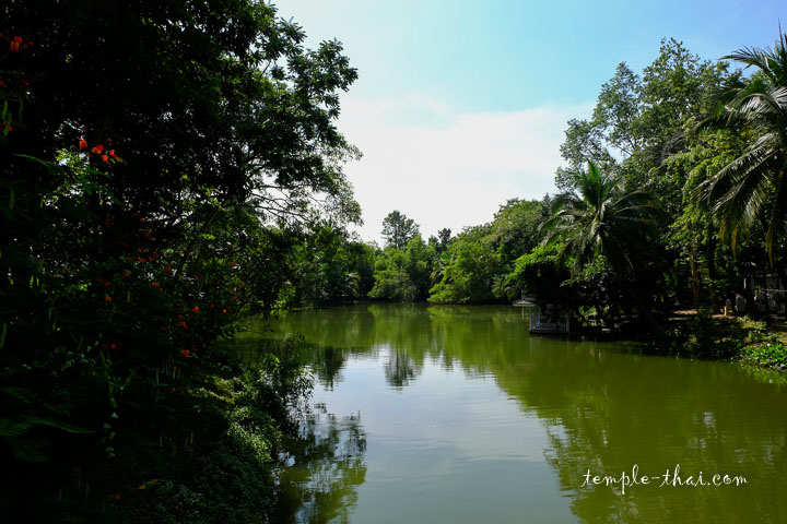 Le reste du monastère est paisible, les différents édifices étant disséminés dans un vaste parc. L’Ubosot de couleur blanche est comme déposé sur un îlot.