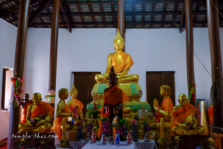 L’intérieur est sobre avec l’autel accueillant le bouddha principal. Notez que vous retrouvez dans cette salle des colonnes similaires à l’extérieur pour soutenir la structure.