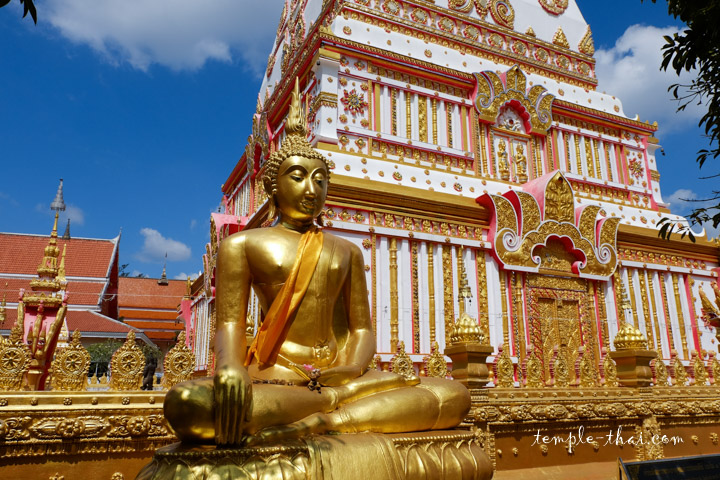 De l’autre côté de la route, vous devriez déjà apercevoir le Chedi. Si vous êtes déjà allés dans la province de Nakhon Phanom, l’allure de ce stupa monumental vous rappellera nécessairement le Phrathat Phanom (พระธาตุพนม), le lieu le plus sacré de la région Isan.