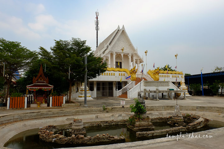 À l’autre bout du temple, proche d’un affluent du fleuve Tha Chin, l’Ubosot blanc surélevé se démarque dans le paysage.