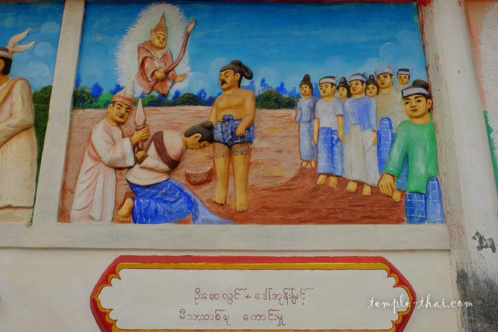 Au niveau de sa base, des niches accueillent des bouddhas bicolores blancs et dorés, alors que sur les murs voisins se trouve des bas-reliefs originaux dont les légendes sont écrites à l’aide de l’alphabet birman.