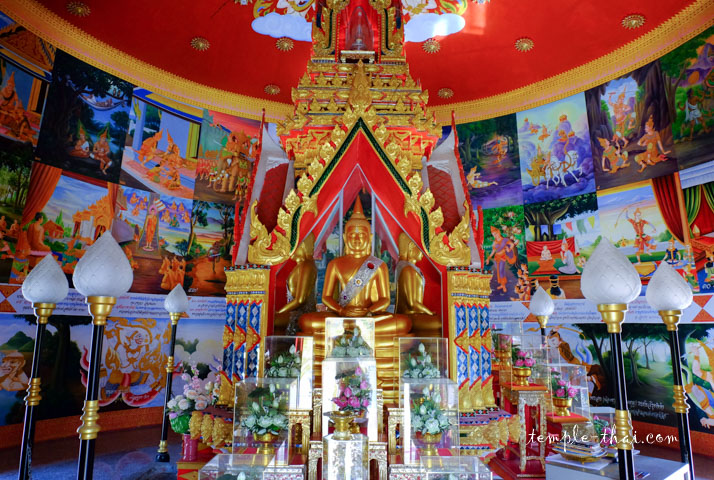 Au centre de la pièce, quatre statues du Bouddha sont placées en direction des points cardinaux. Les reliques sont placées au dessus d’eux, dans une urne transparente.