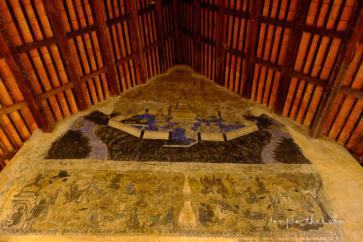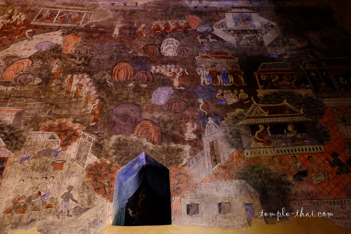 À l’intérieur les fresques datant du XIXe siècle recouvrent les murs, les fenêtres, et même les planches en bois faisant office de plafond. Ce sont les peintures bouddhiques les plus marquantes de la province de Singburi.