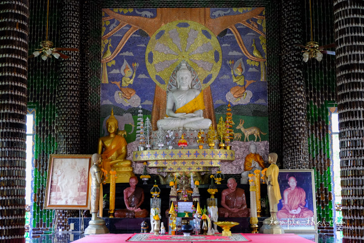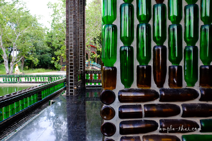 Au fil des années, dans un but autant pédagogique que religieux, les moines ont récupéré des bouteilles afin de bâtir plusieurs édifices. Ils ont principalement utilisé des bouteilles de bières dont le logo représente un pachyderme (Chang), mais pas uniquement.