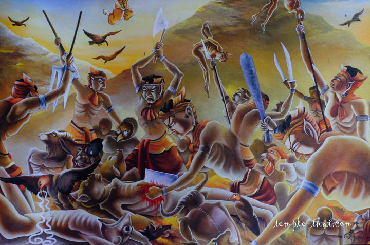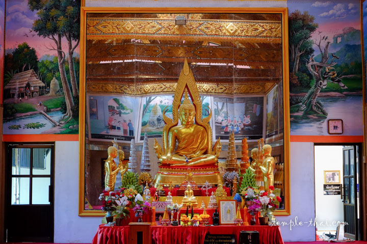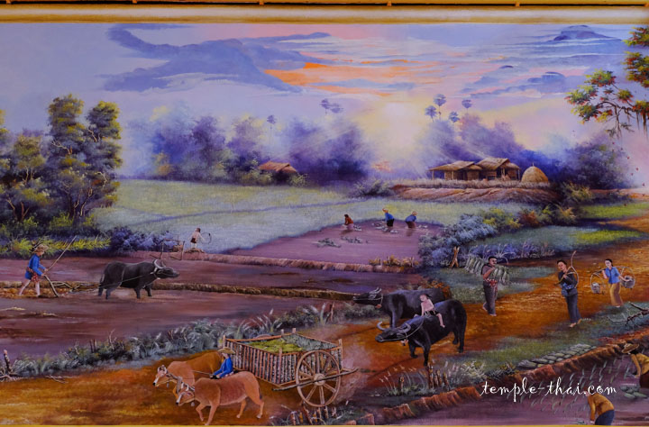 À l’intérieur, les peintures en hauteur illustrent de manière réaliste la vie paisible à la campagne dans ces villages de l’Isan.