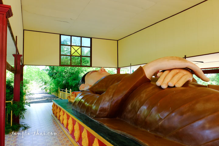 Plus loin, un pavillon a l’air libre héberge un long bouddha couché du nom de Phra Phuttha Parinipapan (พระพุทธปรินิพพาน).