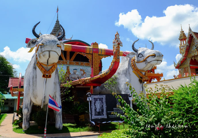 Outre ce stupa, vous pouvez visiter un Viharn original puisqu’il prend la forme d’une immense cargaison posée sur un chariot tirée par des buffles (!).