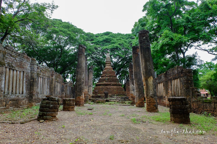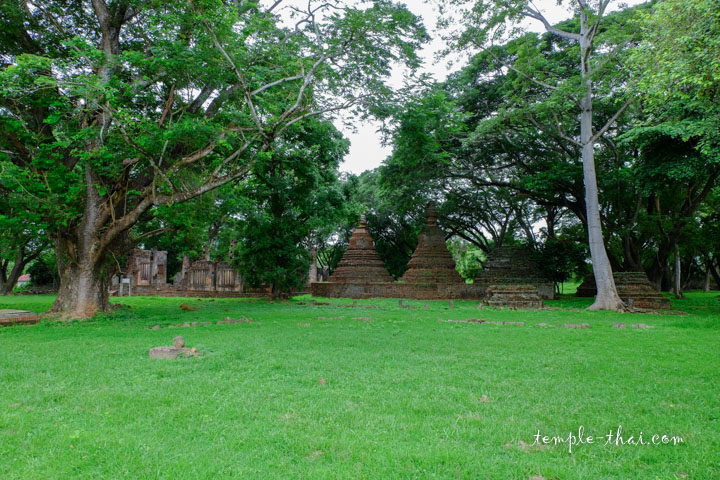 Non seulement la configuration est identique, mais ses trois stupas en latérite sont similaires par leur forme à ceux d’Ayutthaya, dans des dimensions néanmoins sans communes mesures avec ceux de l’ancien temple royal.